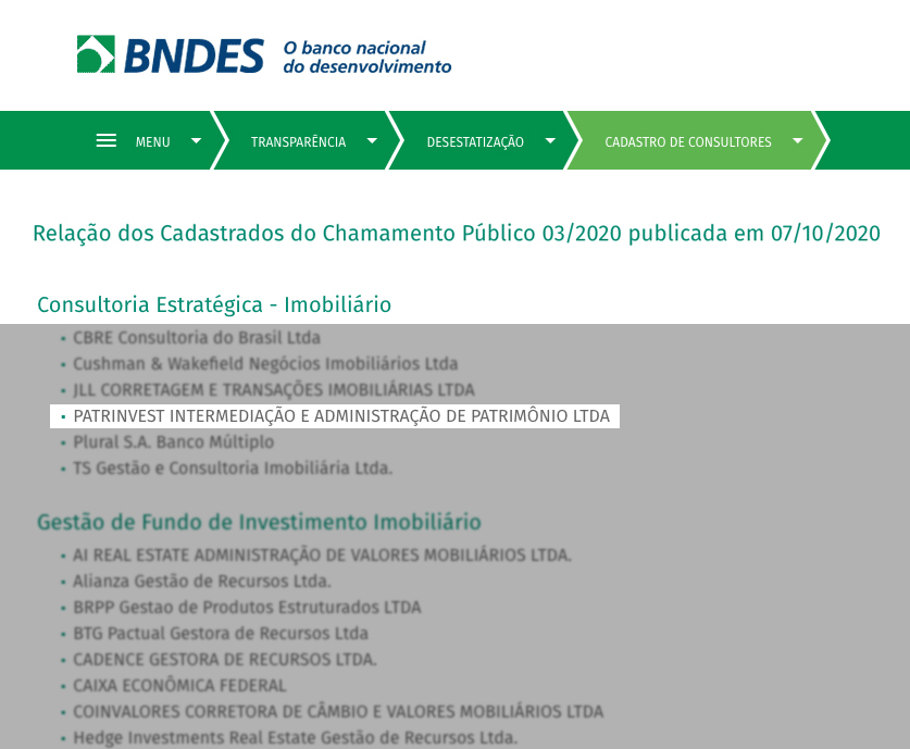 A Patrinvest foi uma das 6 empresas cadastradas no Brasil selecionadas pelo BNDES para a participação no processo de desestatização imobiliária.