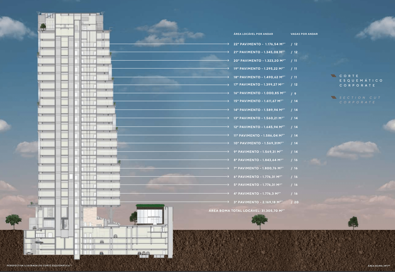 Com 20 andares, a torre corporativa é composta por lajes corporativas de alto padrão, com dois conjuntos por pavimento. As lajes possuem áreas a partir de 1.000 m², totalizando mais de 30.000 m² de área locável.